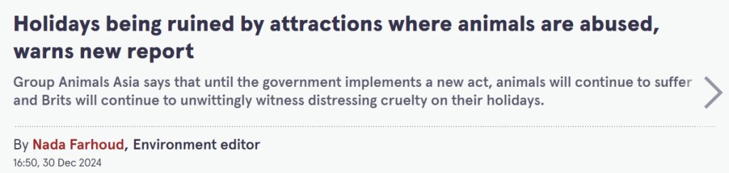 The Mirror led with the headline: ‘Holidays being ruined by attractions where animals are abused, warns new report’. This angle is not surprising. Human readers of human newspapers are predominantly concerned with the human aspect of any story.
